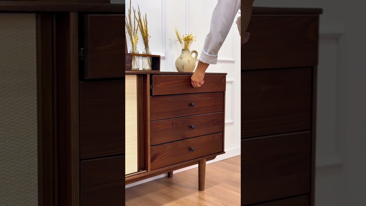 Das Sideboard Simona vereint modernes Mid-Century-Design mit natürlichen Materialien. Die Kombination aus massivem Kiefernholz in Kastenien-Optik und stilvollem Rattan-Geflecht macht es zum Blickfang in jedem Raum. Vier geräumige Schubladen und zwei Schiebetüren bieten praktischen Stauraum. Ob im Wohnzimmer, Flur oder Esszimmer – unsere Anrichte mit Rattan ist ideal für moderne und natürliche Einrichtungsstile.